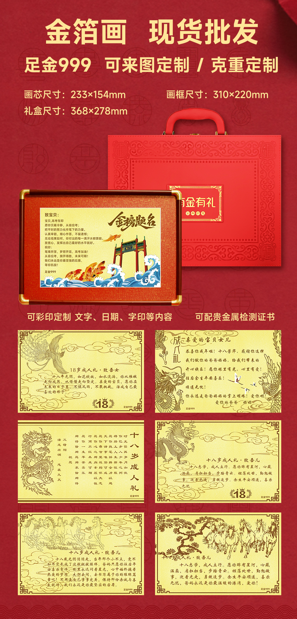 金箔画定制黄金工厂定制 18岁成人礼金榜题名来图定制